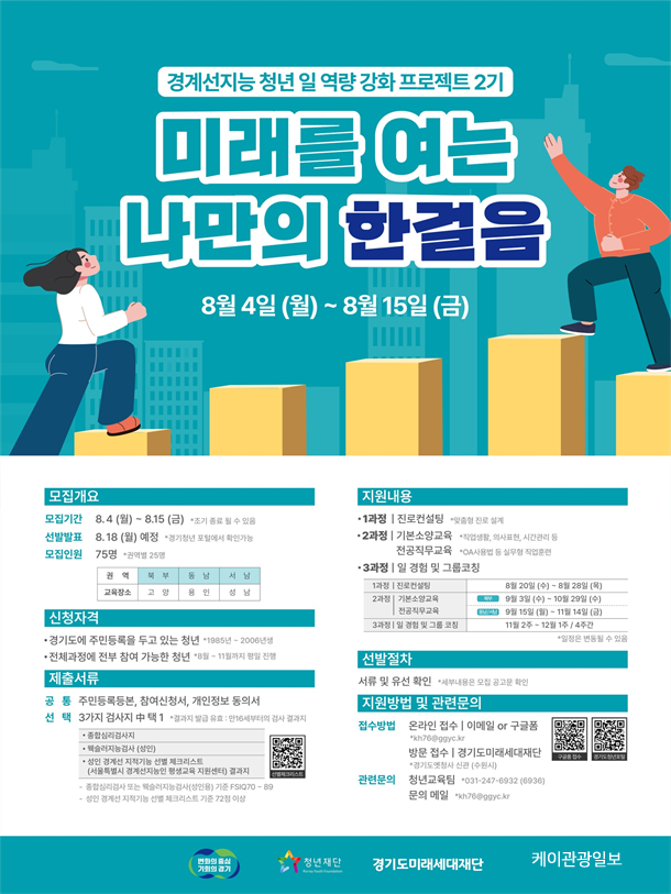 경기도가 경계선지능 청년의 자립과 노동시장 진입을 지원하는 ‘경계선지능 청년 일 역량강화 프로젝트’ 2기 참여자를 15일까지 모집한다.